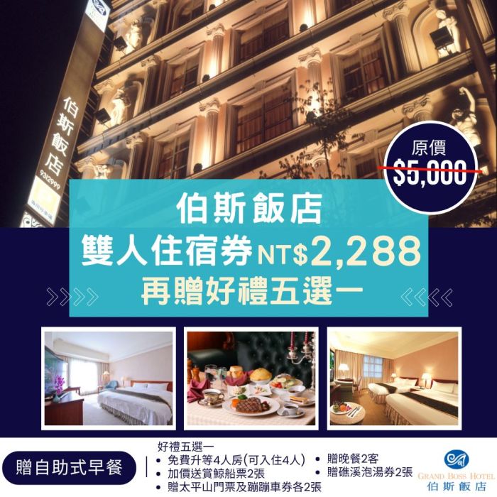 *【好禮一、三、四】平日每加一人同房,另加NT$999,含早餐及使用票券。